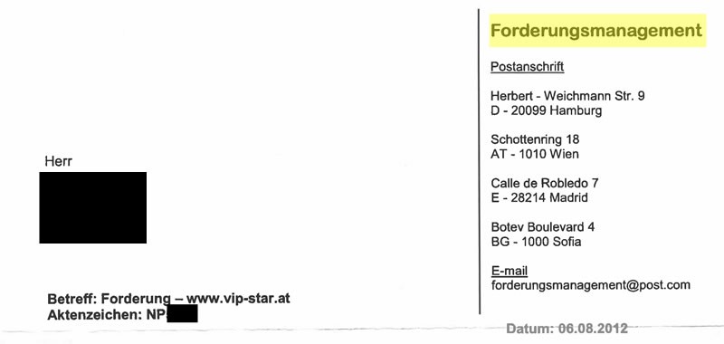 Diese Schreiben sind mit 06.08.2012(!) datiert und haben Änderungen in der angeblichen Firmenanschrift und im "Firmennamen!: